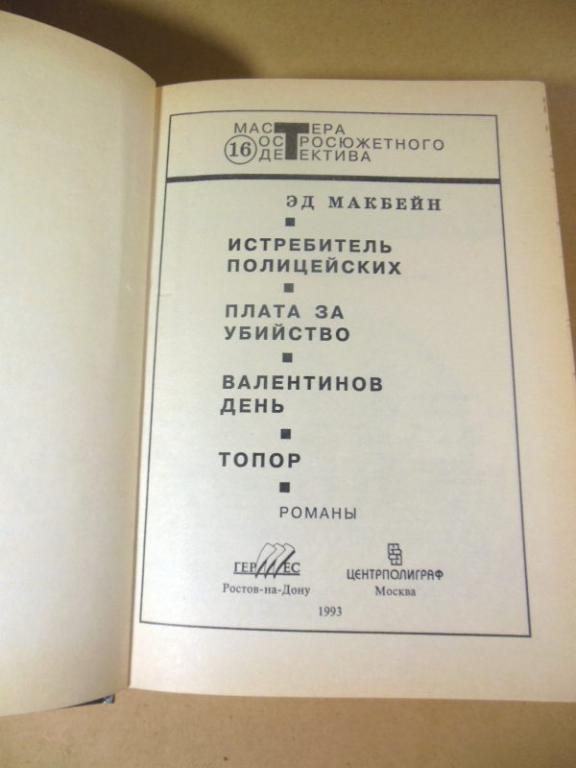 Эд Макбейн. Истребитель полицейских, детективные романы. Выпуск 16. М. Центрполиграф 1993г. 493с. Палiтурка / переплет: твердый, обычный формат.