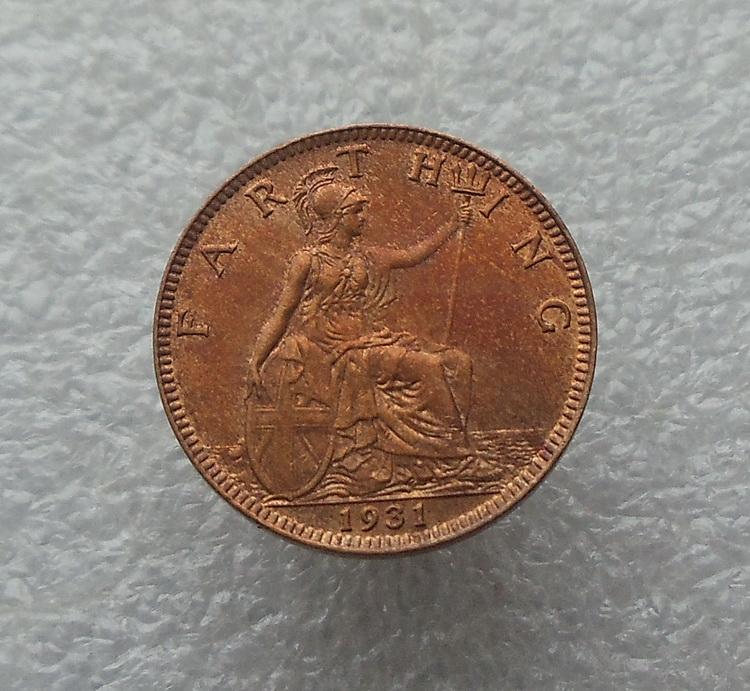 Предлагается монета Великобритании -- фартинг 1931 г. Состояние, по субъектвной оценке -- Unc, темнеющий бронзовый цвет с отливом (признак штемпельного блеска). "Следы мешка", также субъектвно -- единичные.