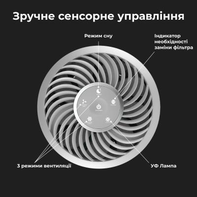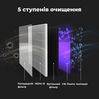 Воздух проходит 5 ступеней очистки через предыдущий фильтр, HEPA фильтр 13 и угольный фильтр. Последние два этапа очистки – дезинфекция с помощью УФ-лампы и ионизация.