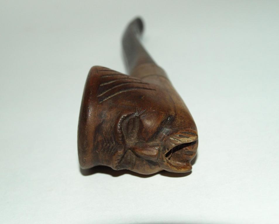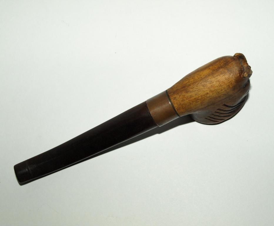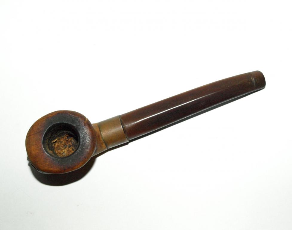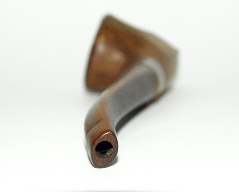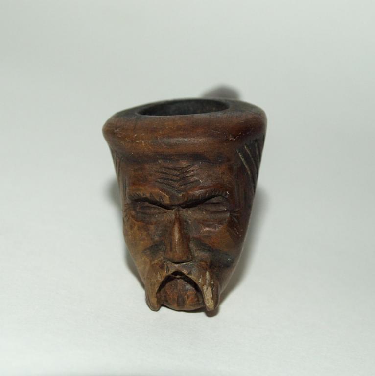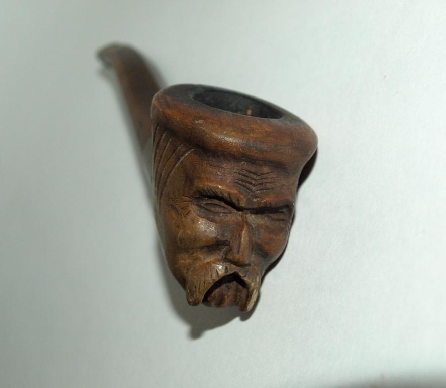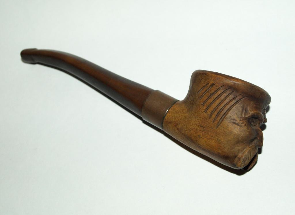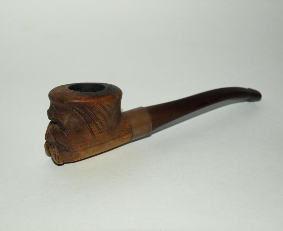 Старинная гуцульская эксклюзивная курительная трубка. Судя по всему авторская работа, единичный экземпляр. Чаша - дерево, с резьбой - лицо гуцула. Медное или бронзовое кольцо (не чистил от патины - поэтому точно сказать затрудняюсь), из чего мундштук - сказать затрудняюсь, вытащить из чаши не смог, не хотел, что нибудь сломать. Общая длинна трубки с мундштуком - 14см. Отличный экземпляр для Вашей коллекции!