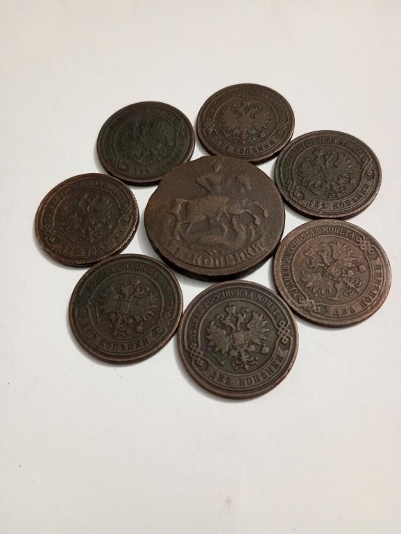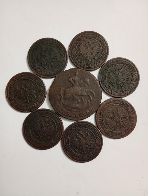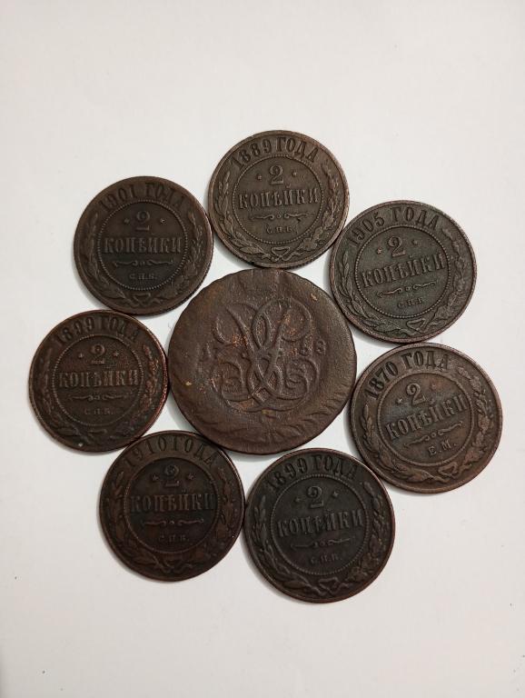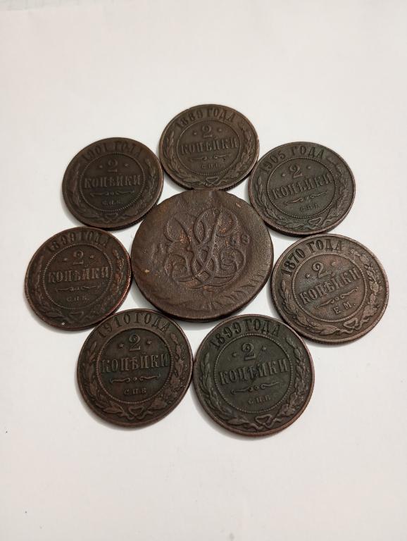 Монеты разных годов и разных правителей. Елизавета Петровна - 2 копейки и девушки Александр 2, Александр 3, Николай 2, в хорошей сохранности. Борильеф сохранился хорошо, механических повреждений нет. Чистились лимонной кислотой.